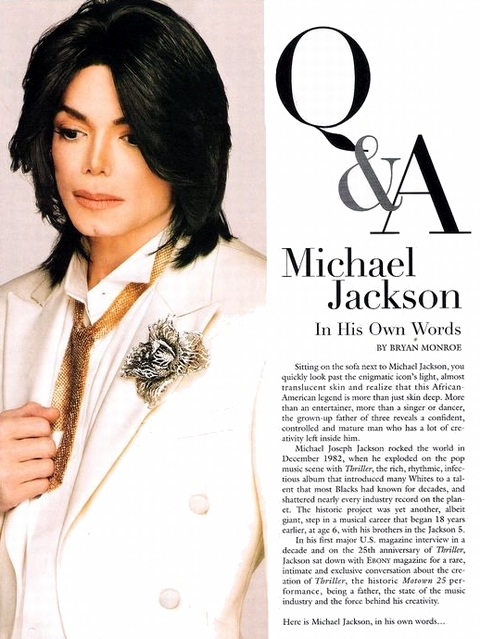 Part.3 からの続き Part.4EBONY: 今やあなたはもうすぐ50歳です。80歳になっても、こういうことをやっていると思う? Michael: 正直に言うと、うーん、ノーだね。ジェームズ・ブラウンがやったような、あるいはジャッキー・ウィルソンがやったようなやり方ではノー、彼らは最後まで走り続けて、自ら命を縮めたんだ。僕の意見だけど、(ジェームズ・ブラウンは)スロー・ダウンして、もっとリラックスして、自分のハード・ワークをもっと長く楽しんでくれたら良かったのに、と思うよ。 >> 続きを読む >> EBONY: またツアーを行うつもり? Michael: 長期のツアーには関心がないな。でも、ツアーをやることで僕が大好きなのは、芸が美しく研ぎ澄まされることなんだ。ブロードウェイで僕が好きなのはそこなんだ、だから役者たちはブロードウェイに向かう、自分のスキルを磨くためにね。グレイトなエンターテイナーになるには何年もかかるから。何年もね。 それから、スティーヴィー・ワンダー、彼は音楽の予言者だよ。僕が信頼を置くべき一人はまさに彼。僕はよく自分に言い聞かせていた、「もっと曲を書きたい」。僕はよく見てたもんだよ、ギャンブル&ハフや、ハル・デイヴィス、ジャクソン5のヒット曲をすべて手掛けていたコーポレーションをね。僕は本当にその仕組みを学びたくてね。彼らのやり方っていうのは、彼らはいつも、トラックを作り上げた後に僕らを入れて歌わせた。僕はいつも慌ててたよ、だって僕は、彼らがトラックを作るところを見たかったんだから。『ABC』にしろ『アイ・ウォント・ユー・バック』にしろ『ラヴ・ユー・セイヴ』にしろ、彼らはトラックを完成させてから僕に渡した。僕はホントはそれらを全部経験したかったな。 スティーヴィー・ワンダーは、僕を、文字通り壁の上のハエみたいにただそこに座らせておいてくれたものだよ。僕は『Songs in the Key of Life』が作られるのを目撃したんだ、最もゴールデンなことのひとつだね。僕はマーヴィン・ゲイの横にも座ってた。こういう面々は、我が家に集まって週末に僕の兄弟たちと野球をしたりして過ごした人たちなんだ。僕らのまわりにはいつもこういう人たちがいた。だから、本当にサイエンスや仕組みや構造、どうやってすべて作られていくのかを目にすることが出来た時には、ただただワンダフルだよ。 EBONY: 大統領選についてはどう思う?ヒラリー、それともバラク? Michael: ホントのことを言うとね、その手の問題は僕はフォローしてないんだ。世界の問題を人が解決できると期待しないように言われて僕らは育った。彼らには出来ない。それが僕の見方さ。僕たちを超えたものなんだ。ほら、僕らは大地をコントロールできないでしょ、揺れる時は揺れる。海もコントロールできない、津波は起きる。空もコントロールできない、嵐は起こる。僕たちはみんな神の手の内にある。人間はそのことを考慮に入れておかないといけないと思うよ。僕はただ彼らに、もっと赤ん坊や子どもたちのためになることを希望するよ。もっと彼らを助けることをね、そうなれば素晴らしい、そうじゃない? EBONY: ベイビーといえば、今は父親として、25年前に巻き戻しして、「あの時の」マイケルと、今現在のマイケルの間の違いって何かな? Michael: 「あの」マイケルはたぶん、おそらくここにいるのと同じマイケルだよ。最初、僕はただいくつかのことを成し遂げたいと思ってた。でも、頭の片隅にはいつもあったんだ、子どもたちを育てたい、子どもたちを持ちたい、って。僕は今とても楽しんでるよ。 EBONY: あなたに関して出る色々なもの、あなたが読むすべてにものについてはどう思う?ああいったものをどう感じる? Michael: 僕は関心を払わない。僕の意見では、あれは「無知」なんだ。たいてい事実には基づいてない。何に基づいてるかっていうと、わかるよね、幻想さ。会ったことのない男、誰でも近所に見たことのない人間がいると、彼について噂話をはじめるよね。彼についての物語を目にすることになるわけさ、彼があんなことした、こんなことした、そういう神話をね。みんなクレイジーだよ! 僕はただ、ワンダフルな音楽をやりたいだけなんだ。 でも、モータウン25の話に戻るけどね。僕が一番感動したことのひとつなんだ、僕がパフォーマンスした後──忘れもしないよ。マーヴィン・ゲイがステージ袖にいて、それからテンプテーションズ、スモーキー・ロビンソン、それに僕の兄弟たち、彼らが僕をハグして、キスして、僕を抱き締めてくれた。リチャード・プライヤーが僕の方へ歩いて来て言った、(静かな声で)「私が今までに見た中で最もグレイトなパフォーマンスだったよ」。それが僕の報奨だった。こういった人たちは、僕がインディアナのゲイリーでまだ小さかった頃によく聴いていた人たちなんだ。マーヴィン・ゲイ、テンプテーションズ、彼らに僕が評価を授けてもらえるなんて、ホントに光栄だった。それから次の日に