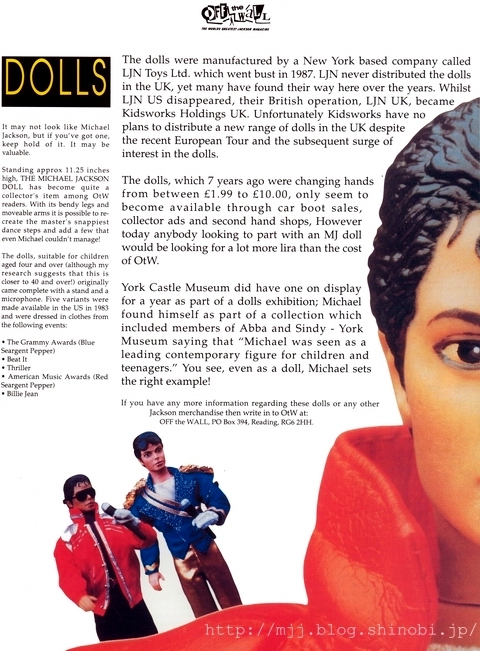 「古文書」を紐解いてみましょう──知る人ぞ知る、UKのファン雑誌『Off the Wall』18号、1992年10/11月号からの1ページ。 このページは、グッズ通販などの広告ページではなく、この記事が書かれた1992年の時点からの視点で、「かつてこういうマイケル人形が作られた、これこれこういう貴重な人形で・・・さらに情報をお持ちの方は、OtW事務局までご一報を!」という、ちょっと「な○でも鑑定団」テイストな、無性にワクワクする書き方がなされています。私は当時、この記事を見て、「わー、マイケルが人形になってる、なんてスゴイんだ!いつか外国に行ったら、買いたいなー!」と、小学生らしく、わけも分からず狂喜乱舞していたものです(本当です)。 現存数から考えれば、この人形は2010年現在でもけっして「レア」とは言えず、状態を気にしなければ、ネット・オークションなどで2000~4000円程度から買える、年代モノとしては比較的カジュアルなアイテムです(元々、高価な商品ではなく、あくまでも子どもがお小遣いで買えるお人形。作りも極めてチープ、そこがかわいい)。ですが、言うまでもなく、1983年とか1992年とかというのは、インターネットもネット・オークションも無い時代。アメリカでは爆発的に流通したこのMJ人形も、日本や、OtW誌の本拠地イギリスでは、「あこがれの舶来物、海を越えてやって来たお人形~」って感じで、今以上に貴重品に思えたに違いない。 前置きが長くなりましたが、そういう時代背景を踏まえて、記事を読んでみましょう。 DOLLS マイケル・ジャクソンのようには見えないかもしれないが、もしもあなたがそれを手に入れていたのなら、ぜひそのまま持っておくように。価値があるかもしれないよ。 高さ約11.25インチ、ザ・マイケル・ジャクソン・ドールは、OtW読者の間では、なかなかのコレクターズ・アイテムだ。曲がる脚と動かせる腕で、本人のダンス・ステップもビシッと再現可能、さらに、マイケルでさえも出来ないような動きも! この人形、4歳以上からの子どもたち向け(とはいえ、私のリサーチでは、実際は40歳以上、の方が近いようだ!)であるが、オリジナルではスタンドとマイクロフォンが付属していた。アメリカで1983年に5種類が製造され、それぞれ以下のイベントの衣装が着せられていた: ・グラミー賞(青のお巡りさん) ・ビート・イット ・スリラー ・アメリカン・ミュージック・アワード(赤のお巡りさん) ・ビリー・ジーン 人形は、ニューヨークを拠点とする LJN Toys Ltd.という会社が製造し、その会社は1987年につぶれた。LJN はこの人形をイギリスには配給しなかったが、それでも数多くが海を渡ってやって来た・・・(中略) 人形は、7年前とは持ち主も変わり、1.99ポンドから10.00ポンド、カー・ブート・セール(=フリーマーケットのようなもの)や個人売買、中古品の店でしか手に入らないようになったように思われるが、昨今この人形を手放そうと考えている人はみな、OtWの価格よりも高い金額を期待するようだ。 ヨーク・キャッスル・ミュージアムが一体所有していて、人形展の一部として1年間展示された; マイケルは、アバやシンディの仲間としてコレクションのなかに自らを発見(するだろう)──ヨーク・ミュージアムによれば、「マイケルは、子どもたちやティーンエイジャーたちにとって、先頭に立つ時代のお手本として見られていました」。ほらね、人形としてでさえ、マイケルは正しいお手本を示すのだ! これらの人形や、他のジャクソン・グッズに関する情報をお持ちの方は、以下の住所OtWまでお便りを: OFF the WALL 私書箱・・・・・・ ちなみに、5種類のうち、2010年現在オークションなどでよく見かけるのはやはりスリラー、AMA、グラミーの衣装のものかな。ビート・イットもたまに見かけます。なぜかビリー・ジーンは一番見かける頻度が少ないような気がするのですが、キッズ向けのドールということで、やはり黒よりもカラフルで豪華な印象の衣装の方が受けたのかもしれませんね。もちろん衣装だけのパッケージも出ているので、1体の人形で着せ替えて遊べます。 (そして、服を脱がすとなかなか衝撃的なチープさが・・・!本来着せ替え人形は、服を着せてなんぼのモノであり、ボディの造形は非常に大雑把。服を着ていないと、はっきり言ってモデルが誰なのか忘れそうになる(笑)。それから、以前、この人形を数多く扱っている輸入おもちゃ屋の人が、「足首から下のパーツが両足とも左足、とか、ちょっとした不良品率も割と高い」みたいなことも言っていました。しかもその程度の品質のばらつきは不良品とはみなされず、普通に売られる。当然、1体1体の顔つきなんかもけっこう個体差で違ってくるわけで・・・チープなりに、愛着の沸くドールです。) 「わーい、立体マイケル、3Dのスリラーだ!ゾンビに囲まれたー!なんで笑顔でマイク持ってるのさ。ジョーン!オーラちゃーん!」(マウスを乗せて3D) |