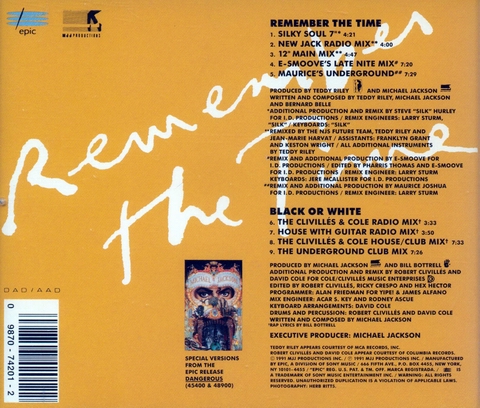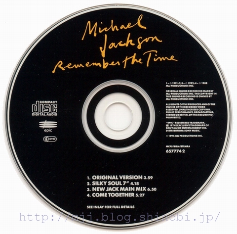 うちには2バージョンありました。オゥノー、偉そうに図鑑コーナーと言っておきながら、肝心の日本盤を、私は買ってませんでした ![]() 情報提供、お待ちしております! >> 続きを読む >> この曲も何種類ものバリエーションのCDが発売されましたが、なかでも(もしかしたら、全シングルのなかでも)最強シングルといえば、これでしょう! アメリカ盤 Michael Jackson REMEMBER THE TIME ( 9870742012 / カタログNo. 49K 74201 ) 1992年2月14日リリース 定価 $7.49 (日本では当時輸入盤屋で1000円ちょいくらいで買ったような気がします。) 1. REMEMBER THE TIME [Silky Soul 7"] 2. REMEMBER THE TIME [New Jack Radio Mix] 4. REMEMBER THE TIME [E-Smoove's Late Nite Mix] 5. REMEMBER THE TIME [Maurice's Underground] 6. BLACK OR WHITE [The Clivilles & Cole Radio Mix] 7. BLACK OR WHITE [House With Guitar Radio Mix] 8. BLACK OR WHITE [The Clivilles & Cole House/Club Mix] 9. BLACK OR WHITE [The Underground Club Mix] オススメ指数 (※2010年現在、中古盤を買う場合。管理人の独断でズバリ言うわよ調べ)収録内容充実度・・・★★★★★ ![]() ジャケ買い度・・・★★★★★ 巻き舌・ドゥラララッ、ダッダッ、ホーーーゥ!度・・・★★★★★ レア度・・・★★☆☆☆ バカ売れしたので、数は多い。 価格・・・ややプレミア化。「定価以下で」はちょっと難しいかも。頑張れば良い状態の盤も2~3000円台でGET可能。モノにこだわらないならダウンロードで、1曲100円くらい。 総合点・・・★★★★★ 収録タイム、50分超!しかも、オリジナルのアルバム・バージョン含まず、なので、これは完全に、単なる「シングル」ではなくて、独立した「リミックス・アルバム」に近い位置付けかもしれません。後半の『BLACK OR WHITE』の4トラックは、先に出ている『BLACK OR WHITE』のUKシングル盤とほぼ重複ですが、日米のファンは、むしろこの1枚で2度おいしい『REMEMBER THE TIME』の方で、リミックスを認知した人が多いはず。 ちなみに、日本盤の『リメンバー・ザ・タイム・ザ・リミックス トラックだけなら現在はダウンロード購入も可能ですが、この盤は、カラシ色のディスクのピクチャープリントからジャケ写から、とにかくどこをとっても全体が容姿端麗なので、ぜひCD現物を手にしてほしい1枚です。ちなみに、ケースは1cm厚の普通のジュエルケース。ジャケ写はブックレットにはなっていなくて、紙1枚ペラッと入っています。 ニュー・ジャック・スウィング、最高!テディ・ライリー、大好き!ドン・ストップ、マイコー!な気持ちになる良盤です。 ヨーロッパ方面では、7mmの厚さのスリム・ケースに入った「マキシ・シングル」として、こちらの盤が登場。 Michael Jackson REMEMBER THE TIME ( 5099765777420 / カタログNo. 657774 2 ) 1992年リリース 定価 ? 1. REMEMBER THE TIME [Original Version] (3:59) 2. REMEMBER THE TIME [Silky Soul 7"] (4:18) 3. REMEMBER THE TIME [New Jack Main Mix] (6:50) 4. COME TOGETHER (5:27) オススメ指数収録内容充実度・・・★★★★☆ ジャケ買い度・・・★★★★★ マキシ・ケースなので外側からディスクのデザインも眺められるし。 レア度・・・★★☆☆☆ 売れたんです。 価格・・・数が多いので、せいぜい元の定価くらいの良心的な中古価格で流通している。 総合点・・・★★★★☆ 「オリジナル・バージョン」+「リミックス2トラック」+「カップリング1曲」という4トラック盤。マキシシングルとして、折り目正しいごく標準的なボリュームといえます。 カップリングの『COME TOGETHER』は、言うまでもなく、オリジナルはビートルズ。映画『MOONWALKER』のラストでマイケルが披露しているカヴァー・トラックですが、このシングル発売の時点では、「アルバム未収録曲」ということで、マキシらしい嬉しい特典要素でした。(後に、アルバム『HISTORY』に収録。) 個人的に、黒のシンプルなディスクは、ヴィニール盤の雰囲気というか、カッコよくてお気に入りです。外側からCDが見えるマキシの7mmケースの場合、そういう細かい点もコレクターにとっては重要だったりします! マイケルはよく、親しい人やお世話になった人への献辞を作品に付与しますが、この欧州盤マキシの内側には、「DEDICATED WITH LOVE TO DIANA ROSS(ダイアナ・ロスに捧ぐ、愛を込めて)」の文字が読めます。 というわけで、『REMEMBER THE TIME』の、全・公式ミックスは以下。 ![]() New Jack Mix New Jack Radio Mix ![]() New Jack Main Mix ![]() New Jack Jazz (21) 12” Main Mix ![]() Bonus Beats 3 A Cappella Silky Soul 12” Mix Silky Soul 7” ![]() Silky Soul Dub E-Smoove’s Late Nite Mix ![]() E-Smoove’s Late Nite Dub Maurice’s Underground ![]() Mo-Mo’s Instrumental New Edit Version (『VISIONARY』ボックス・セット収録) 多いなぁ・・・ ![]() のミックスが、アルバム『DANGEROUS』及び、上で紹介しているシングルCDでコレクトできたトラックです。全然、制覇できてないな(笑)。降参。参りました。なお、残りのトラックのうちいくつかは、この後、他のマキシシングルの収録としてまたいずれ登場してきます。 |