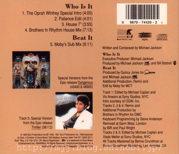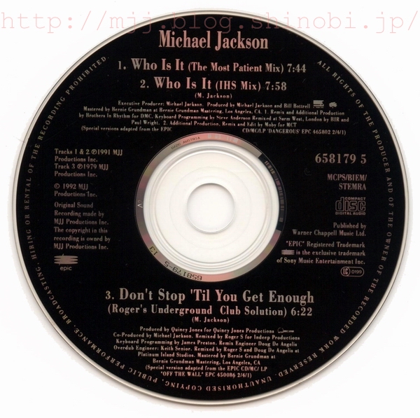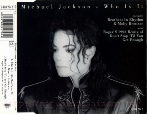 ヨーロッパ方面では、7mmの厚さのスリム・ケースに入った「マキシ・シングル」として、こちらの盤が登場。 オーストリア盤(UK・ヨーロッパで流通) Michael Jackson WHO IS IT ( 5099765817959 / カタログNo. 658179 5 ) 1992年6月リリース 定価 ? 1. WHO IS IT [the Most Patient Mix] (7:44) 2. WHO IS IT [IHS Mix] (7:58) 3. DON'T STOP 'TIL YOU GET ENOUGH [Roger's Underground Solution] (6:22) オススメ指数収録内容充実度・・・★★★★☆ ジャケ買い度・・・★★★★★ ファン雑誌での人気投票、堂々の第1位! レア度・・・★★★☆☆ 価格・・・やや高めで推移、でもこの曲のシングルの中では最も安く容易に入手できる。新品に近い良品の流通が、定価よりちょい上、くらいから。 総合点・・・★★★★☆ 悶々と孤独に苦悩する夜はこの曲に決まり。 オリジナルのバージョンは入っていなくて、「リミックス2トラック」+「カップリング1曲」という3トラック盤。ボリュームは控えめですが、濃い選曲です。 カップリングは、クラシック・チューン、『DON'T STOP 'TIL YOU GET ENOUGH』のリフレッシュ。前に、『JAM』のシングル紹介の時に、マスターズ・アット・ワークのリミックス『DON'T STOP~』が登場しましたが、今回はブラザーズ・イン・リズムが担当したバージョンです。一つのお題に対して、気鋭のリミキサーたちのアイデアを聞き比べ。 最高にクールなジャケ写も人気です。ファン雑誌『OFF THE WALL』のジャケ写人気投票で堂々の第1位。こんなに絶妙に、顔の前にゆるゆるウェービーヘアを垂らすことができるのは、私の知る限り、この人しかいません。革ジャケットもカッコいい!ディスクのプリントも、シンプルですがイメージに合ってます。 5トラックの欧州盤も存在。上の3トラック盤に比べて少しレアです。ちなみに、日本盤は、この5トラックの方の収録内容が採用されています。(右のアマゾンのリンク、上は欧州5トラック盤、下は日本5トラック盤。) オーストリア盤(UK・ヨーロッパで流通) Michael Jackson WHO IS IT ( 5099765817982 / カタログNo. 658179 2 ) 1992年6月リリース 定価 ? 1. WHO IS IT [7" Edit With Intro] (4:10) 2. WHO IS IT [the Most Patient Mix] (7:44) 3. WHO IS IT [IHS Mix] (7:58) 4. WHO IS IT [P-Man Dub] (7:31) 3. DON'T STOP 'TIL YOU GET ENOUGH [Roger's Underground Solution] (6:22) オススメ指数収録内容充実度・・・★★★★★ 3トラック盤よりリミックスが一つ多い。 ジャケ買い度・・・★★★★★ レア度・・・★★★★☆ 価格・・・ややプレミア価格に上昇中。人気盤なので仕方ないか。 総合点・・・★★★★★ 2トラック分長く苦悩できる。 上の3トラック盤の内容に、オリジナルの音源(エディット)とリミックスが一つ多く入っている形となっています。日本盤も、この5トラックに、このジャケ写です。日本盤はそこそこプレミア価格に上がっているようなのですが、もしかしたら日本盤の方が入手しやすいかな?P-Man Dubにこだわらなければ3トラック盤で十分ですが、あぁ!P-Man Dubもこれがまた、「おちょくられているやるせなさを感じさせるミックス」とでも言いましょうか、なかなか良いんですよ!(笑) アメリカ盤は、オプラ・ウィンフリーのインタビュー(93年)に出演した際にマイケルが即興で歌ったアカペラ・パフォーマンスから人気が出て、急遽、 『GIVE IN TO ME』に代えてシングル・リリースが決定した経緯があります。 Michael Jackson WHO IS IT ( 9870744202 / カタログNo. 49K 74420 ) 1993年4月6日リリース 定価 1. WHO IS IT [the Oprah Winfrey Special Intro] (4:00) 2. WHO IS IT [Patience Edit] (4:01) 3. WHO IS IT [House 7"] (3:55) 4. WHO IS IT [Brothers In Rhythm house Mix] (7:13) 5. BEAT IT [Moby's Sub Mix] (6:11) オススメ指数収録内容充実度・・・★★★★☆ 欧州盤をすでに買っていても、絶妙にかぶらない選曲。 ジャケ買い度・・・★★★★★ 何も言えねぇ。 レア度・・・★★★★★ ジャケ写だけでも、誰でも欲しくなってしまうため、軽く争奪戦。 価格・・・プレミア価格に上昇中。3000円プラス送料くらいは覚悟しておいた方がいいかも。 総合点・・・★★★★★ ジャケ写はなぜか、欧州リリースの時と別のショットが採用され、こちらも恐ろしいくらいカッコいい1枚。この写真、誰が見ても明らかにカッコいいので、この当時、他にもいろいろなPRショットとして使われていましたよね。マイケルの香水の広告とか、オフィシャル・カレンダーとか、雑誌とかあちこち。 リミックスのセレクションは、アメリカ盤では、「イケイケ悪ふざけ系」のハウス・ミックスに重点が・・・3の「House 7"」とか、どうなんですか??(失笑) ここまでいくと、ふざけ過ぎてほとんどアニメ・ソングというか・・・別に良いんですけど、うーん、いろんな意味ですごい。コメントに困りまくり。Mike, I love you and your music...!!! カップリングのクラシック・トラックには、『DON'T STOP~』ではなく、Mobyによる『BEAT IT』が選ばれています。このリミックスも、ど派手にやってくれました・・・インパクト大なミックスなので、他のマキシにもたびたび収録されていて、ちょこちょこ出現します。これ