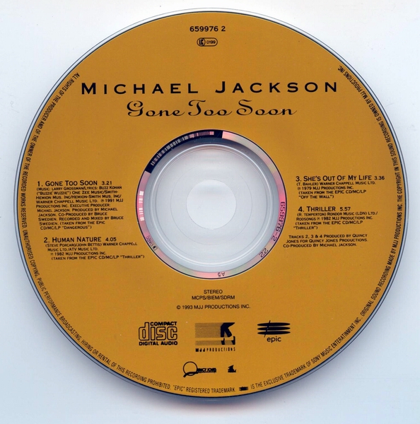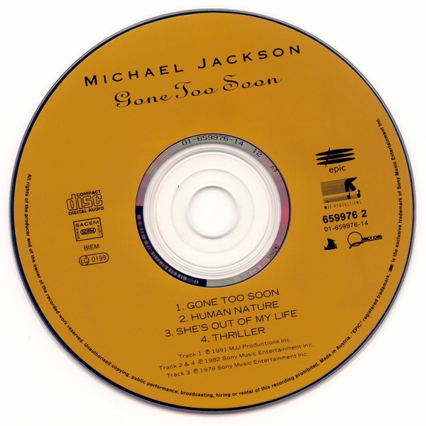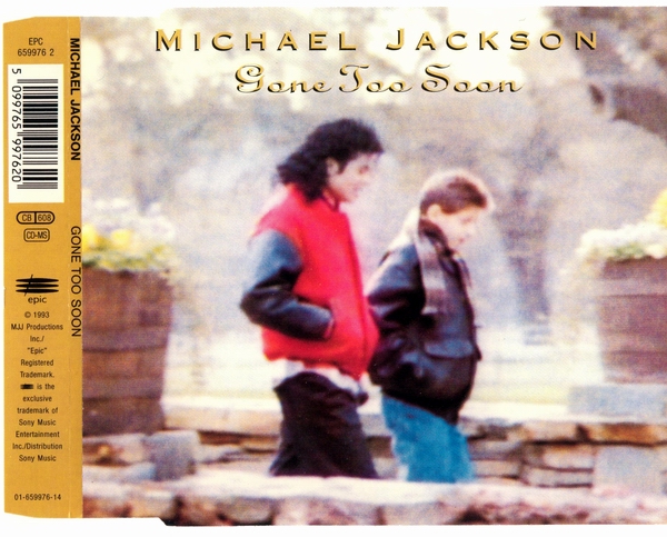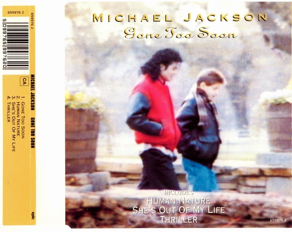 チャート記録だけを見ると大変地味な数字に感じると思いますが、時期を考えると、まず第一に、アルバムのリリースからすでに丸2年が経過した後であること。それから、前のシングル『WILL YOU BE THERE』が出た93年6月から、このシングルの12月という期間が、マイケルと家族とファンにとって、どのような時期だったか思わずにはいられません──過酷なツアー、悪意・嫉妬・欲望・攻撃、ファンの熱狂、あちこち痛くてたまらない、限界を超えて次のステージにも立たないといけない──色々とあって、本来はかなりの健康優良青年だったマイケルが体調不良によりステージをキャンセルする頻度は徐々に増え、結局、ツアー自体が続行不可能となりました。命からがら、ようやく鎮痛剤中毒の治療から戻り、マイケル自身がネヴァーランド・ランチから中継で「釈明会見」を行ったのが、93年12月でした。大変だったけど自分は適切に治療を受け、おかげさまで元気にやっているから安心して、といったことを述べ、また、警察から受けた不当な取調べや、あらゆる根拠なき疑惑に対して自分が完全に潔白であることを説明しました。要するに、「僕は地獄を見てきたんだよ」と、後年のマイケルが笑いながら言う時の「地獄」の一つはきっとこのあたりで、しかもこれで終りなんかじゃない、ということ。残念ながら、こういう異常な状況のアメリカ国内で、まともなやり方で美しい歌を歌って、シングル・ヒットもクソもありません。(Oops, )脇道に逸れました。これらの時期的な話は、『GONE TOO SOON』そのものには直接関係はありませんが、時系列ではそのあたり、ということです。 さて、そんなわけで、2010年現在、この曲のシングルCDを見つけたいと思ったら、最もポピュラーなのは、例によって欧州盤マキシになると思います。Check it out ![]() ヨーロッパ方面では、7mmの厚さのスリム・ケースに入った「マキシ・シングル」として、こちらの盤が登場。 オーストリア盤(UK・ヨーロッパで流通) Michael Jackson GONE TOO SOON ( 5099765997620 / カタログNo. 659976 2 ) 1993年12月リリース 定価 ? 1. GONE TOO SOON 2. HUMAN NATURE 3. SHE'S OUT OF MY LIFE 4. THRILLER オススメ指数 (※2010年現在、中古盤を買う場合。管理人の独断でズバリ言うわよ調べ)収録内容充実度・・・★★★☆☆ ジャケ買い度・・・★★★★★ ライアンと一緒に。 レア度・・・★★★☆☆ 価格・・・定価くらいか、やや高めに推移。 総合点・・・★★★☆☆ リミックスは無し。シンプルに、テイストの近い過去の楽曲をカップリングした4トラックのタイプの盤です。しっとりとした、絶妙な選曲・・・と思ったら、最後に元気良く『スリラー』が出てくるんですが、この時代、いわゆる「マイケル・ジャクソンのベスト・アルバム」のようなタイプのCDはまだあまり出ていないので、シングルCDで、アナログ・レコード時代の名曲をリマスター音源で織り交ぜてくることは、ミニ・コンピ盤のようなニュアンスもあったと思います。 ジャケ写に使われているスナップは、言うまでもなく、在りし日のライアン・ホワイトとマイケル。二人とも寒そうにジャンパーのポケットに手を突っ込んで、お喋りしながら散歩している、ホームビデオからの一コマです。ショート・フィルムにも、ライアンの映像が使われていますが、これはライアンのお母さんの許可を得たものです。また、ライアン自身とも、マイケルは一緒にショート・フィルムを撮ろうと約束していたのだそうですが、実現する前に、この若き友は旅立ってしまいました。ともかく、PR用の写真などとは違って、ピントはぼけぼけなんですが、すっごく良いカヴァーアートじゃない?この、友だち同士の二人はお互いに勇敢な戦士で、普段着で、リラックスして喋りながら散歩してる写真なんてさ ![]() あと、これは細か過ぎてほとんどの人にはどーでもいい話になると思いますが、私はたまたまこのシングルを2枚入手して、どちらもカタログNoは同一の「659976 2」のディスクでしたが、細か~く仕様が異なる盤が存在するみたいです。ヘイ、キッズのみんな、間違い探しの時間だよ ![]() 左; ミスプリント盤(スリラーが短いバージョン) 右; 表記が正確な盤(スリラーが5:57) 右の盤と左の盤では、アートワーク・ディスクのレイアウトがちょっとだけ違います。プラス、左の盤は、たぶん初期のプレスの盤だと思うのですが、明らかなミスプリントが生じていて、紙とディスクのクレジットにはハッキリと「THRILLER 5:57」と書いてあるのに、実際に収録されているトラックは、フルよりも1分以上短縮エディットされた、いわゆるラジオ・エディット(シングル・エディット?)っぽいバージョンが収録されています。右の盤では、書いてある通り、5:57のバージョンが入っています。だからどーした、という話ではありますけども・・・(笑)。でも、こういう明らかなミスプリントは若干珍しいかも。こういうの集めてる人、いるのかな??どっちがよりレア、