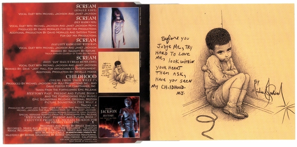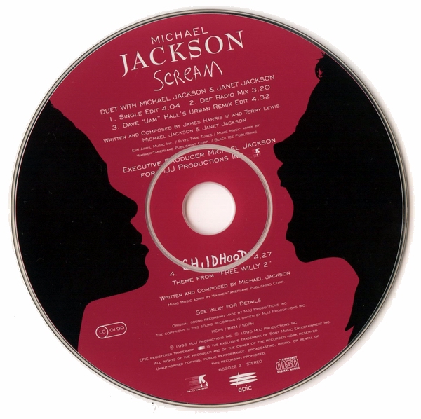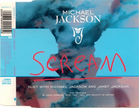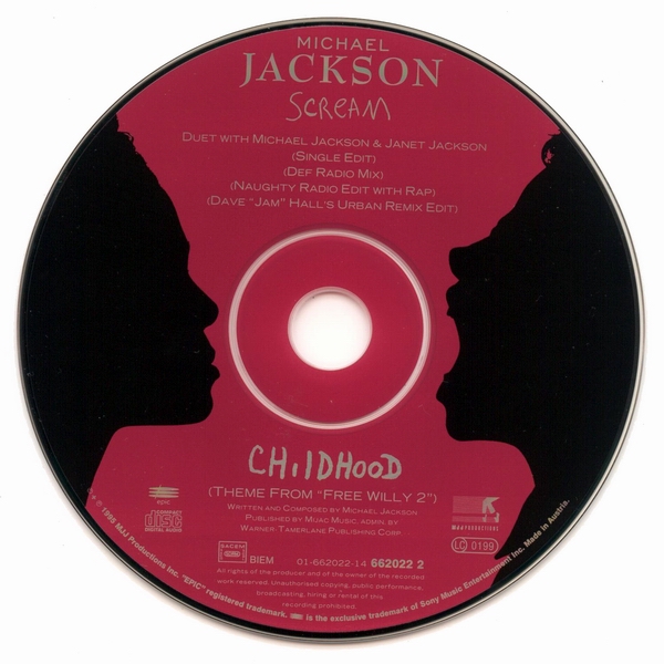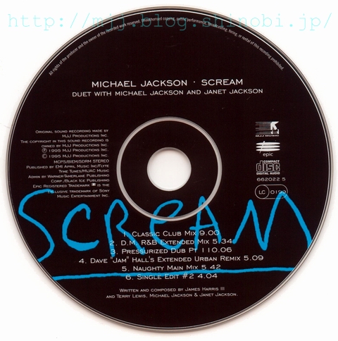 >> 続きを読む >> Michael Jackson SCREAM ( 5099766202228 / カタログNo. 662022 2 ) 1995年5月リリース 定価 ? 1. SCREAM [Single Edit] (4:04) 2. SCREAM [Def Radio Mix] (3:20) 3. SCREAM [Naughty Radio Edit With Rap] (4:31) 4. SCREAM [Dave "Jam" Hall's Extended Urban Remix] (5:09) または、(間違い探しの時間だよ )1. SCREAM [Single Edit] (4:04) 2. SCREAM [Def Radio Mix] (3:20) 3. SCREAM [Dave "Jam" Hall's Extended Urban Remix] (5:09) 4. CHILDHOOD (4:27) オススメ指数 (※2010年現在、中古盤を買う場合。管理人の独断でズバリ言うわよ調べ)収録内容充実度・・・★★★★☆ アメリカ盤より1または2トラック少ない。 ジャケ買い度・・・★★★★★ 2曲とも歌詞のフル掲載あり。マイケル画伯のイラストも大。 レア度・・・★☆☆☆☆ 売れたんです。 価格・・・お手軽価格キープ。UKから取り寄せるなら送料込みで600円くらいから。 総合点・・・★★★★★ 不穏な雲行きの空を背景に、向かい合う横顔のシルエット、という基本アートワークはアメリカ盤と同じですが、全体的な色合いが「赤」なのが欧州盤。トラックは、アメリカ盤よりもリミックスが1つまたは2つ少なく、カップリングに『CHILDHOOD』。 7mmプラスチック・ケースの構造上、アメリカ盤のアートワークとは配置が異なりますが、歌詞の全文掲載と、『CHILDHOOD』イラストの掲載のスペースは、しっかりと確保されています。(歌詞カードは三つ折になっていて、このタイプの他のシングルに比べるとボリューム多め。) 同一のカタログ・ナンバーのディスクなのに、あきらかに仕様が違う(曲目やレイアウトが違う等)ものが生産されているというCDが、これまでにも何枚か登場しましたが、欧州『SCREAM』もその一つです。なぜか5トラックの盤と4トラックの盤が並存していて、アートワークのレイアウトもあちこち細かく違っています。5トラ盤の方が全体的に整った感じがするので、途中で修正されたのかしらん? リミックスの内容は、6トラックのアメリカ盤に入っているものとすべて重複ですから、その点では全部集める必要はまったく無し。じゃあ、なんでミラさんそんなに同じようなCD、何枚も買ったんですか?──Well...頭が少しおかしいからです。(ご安心を、当時、『HISTORY』に喜び過ぎて一時的に錯乱していただけです。断っておくと、私はマイケルの物なら何でも集める人ってわけでは、全然ないよ。実際、集めてるのはCDくらいだなぁ。) 『CHILDHOOD』に関しては、マイケル本人が「お気に入り」としてインタビューなどで言及する機会がわりと多かったように思います。 Michael: 僕たちの一人一人の歴史というのは、子ども時代から始まるんだ、で、この歌『CHILDHOOD』は、僕の人生の反映だよ・・・痛みについて、それに喜びとか、夢みることとか、僕が経験した精神的冒険についてね、僕が子どもパフォーマーで、人と違ったライフスタイルをしていたためのね。僕はステージの上に産まれてきて、『CHILDHOOD』、これは僕の鏡なんだ──僕の物語さ。 『CHILDHOOD』は、マイケル・ジャクソン作品のなかの、数少ない「ライブ録音」曲です。(ライブ録音=コンサート、という意味ではなくて、スタジオでの生熱唱。ほぼ・または完全な「一発テイク」と思われる。) レコーディングは、ニューヨークのヒット・ファクトリー・スタジオにて、1995年3月29日に行われており、この同じ日に、『SMILE』もレコーディングされています。 お次、これも7mmマキシ・ケース入りの盤ですが、ちょっと雰囲気違いの1枚。隠れたオススメ盤。 オーストリア盤(UK・ヨーロッパで流通) Michael Jackson SCREAM ( 5099766202259 / カタログNo. 662022 5 ) 1995年5月リリース 定価 ? 1. SCREAM [Classic Club Mix] (9:00) 2. SCREAM [D. M. R&B Extended Mix] (5:34) 3. SCREAM [Pressurized Dub PT.1] (10:06) 4. SCREAM [Dave "Jam" Hall's Extended Urban Remix] (5:09) 5. SCREAM [Naughty Main Mix] (5:42) 6. SCREAM [Single Edit #2] (4:04) オススメ指数 収録内容充実度・・・★★★★★ ジャケ買い度・・・★★★☆☆ 歌詞掲載無し。ディスクのデザイン簡素、逆にこれもカッコいーんだな! レア度・・・★★☆☆☆ 価格・・・お手頃価格キープ。 総合点・・・★★★★★ 『CHILDHOOD』が入ってなくて、歌詞やイラストなどの掲載も無し。プロモ盤ってわけではないんですが、淡々とクレジットだけが並んでるというさばさばした面構え、でも収録タイムは約40分もあるので、質実剛健!って感じです。カッコいいでしょ。クラブDJ風情。というのも、内容はひたすら『SCREAM』6連発なので、純粋な「リミックス・シングル」という位置づけに思います。 この手のCDでは、飽きさせたら「負け」なので、リミキサー陣のアイデアのショーケースみたいな楽しさがあると思います。で、たまにコケたり、どん引きしたり(笑)。この盤は、大変よくできました コケてもいないし、マイケルがどん引きするようなトラックに侵蝕されてもいないとは思うのですが、最終トラックで聴きなれた「普通のSCREAM」が聴こえてくると、「ホッ」と安心するのはなぜでしょか。3の「プレッシャライズド・ダブ」(相