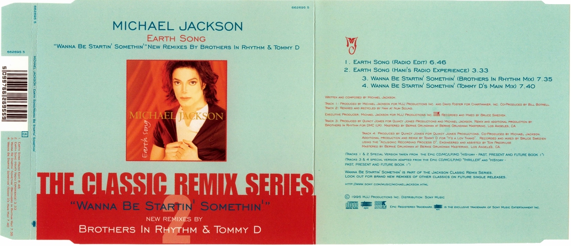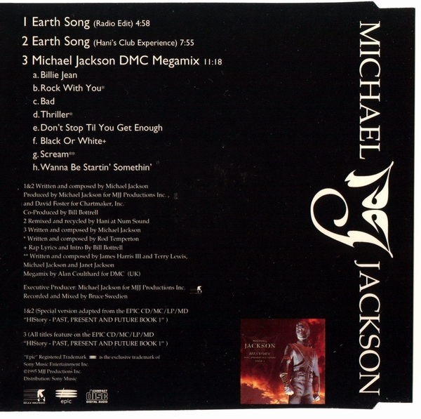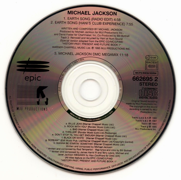 80sの名曲たちが懐かしい人たちにもオススメのディスクばかりです。欧州流通の以下のマキシシングルはすべて、例によって7mm厚のプラスチック・ケース入り。いずれも、基本的に、歌詞の印刷はありません。 オーストリア盤(主にオーストリアやドイツで流通) Michael Jackson EARTH SONG ( 5099766256924 / カタログNo. 662569 2 ) 1995年11月日リリース 定価 (日本では当時輸入盤屋で1000円くらいで買ったような気がします。) 1. EARTH SONG (6:46) 2. EARTH SONG [Hani's Radio Experience] (3:33) 3. EARTH SONG [Hani's Around The World Experience] (14:47) 4. YOU ARE NOT ALONE [Knuckluv Dub Version] (9:38) 5. MJ MEGAREMIX (10:33) オススメ指数 (※2010年現在、中古盤を買う場合。管理人の独断でズバリ言うわよ調べ)収録内容充実度・・・★★★★★ メドレーがゴージャス! ジャケ買い度・・・★★★★★ 白ディスクにMJエンブレムのプリントも ![]() レア度・・・★☆☆☆☆ ミリオンセラー盤なので、中古盤の流通も豊富。 価格・・・安い。 総合点・・・★★★★★ 大人になって以降のマイケルは、普段のテレビ番組に気軽にちょこちょこ出演するというようなタイプではありませんでした。その点、『EARTH SONG』は、マイケルがテレビ放送向けにライブ・パフォーマンスを披露(しかも複数回)していて、イギリスでの「Brit Awards」、モナコでの「World Music Awards」、そして、ドイツの人気番組「Wetten Dass..?」です。 (ちなみにマイケルは、95年の『EARTH SONG』PRの出演の後も、1999年の同番組に、ミレニアム・コンサートの宣伝のためにトーク出演していて、これまたレアなテレビ出演となっています。) さて、トラックに関しては、ズバリ、目玉はメドレー『MJ MEGAREMIX』だと思います。『HISTORY』2枚組のうち、ディスク1は、ご存知のとおり、泣く子も黙って踊りだす超・偉大なベスト盤です。そこでこの時期、新曲のプロモーションと並行して、これまでの輝かしい「彼の物語」をセレブレイトしよう!というお祭気分を盛り上げる「メドレー」でのプロモーションもまた、盛んに行われていました。基本的にそれらのメドレーはあくまでも「宣伝用素材」なわけですが、丁寧に作られていて質が高く、マキシシングルの「特別なオマケ」として最高のプレゼントでした。(メドレーの人気は今でも高く、たしか、2009年の各国別企画盤『KING OF POP』でも、メドレーのトラックをねじ込んだ国の盤が、いくつかあったと思います。) リミックスは、『EARTH SONG』と『YOU ARE NOT ALONE』、いずれもクラブ向けというか、エアロビクス向けというか・・・ 、「ノリの良いビートのマイケル・ジャクソン・トラック」というのは、いつの時代も絶大な需要があって、しかも95年当時というのは、いわゆる「小室哲哉サウンド」に代表される、ユーロビートとかハウスとかの無機質シンセ・ビートが、世界規模で猛威を振るっていた時代です。そのため、「悪くはないんだけど、ユーロビート全開のリミックスは正直言って、『マイケルのフィーリング』ではないよね・・・」という感想が、ちらほら聞こえてきそうな気もしますけど、まぁ、ほら、そこらへんは、ねぇ・・・アレですよ。(「アレって何ですか」と質問しても良いのは、平成生まれ以下の方々だけですYO )なにはともあれ、収録タイム45分超、メドレー入りでジャケ写もかっこよくて数百円なので、お買い得度は満点。欧州でのMJ史上最大ヒットのシングルという意味合いも含めて、各ご家庭に1枚!と言いたいな。ハウスやダブ好きのクラバーの皆さんには特にオススメです。 Michael Jackson EARTH SONG ( 5099766269528 / カタログNo. 662695 2 ) 1995年11月リリース 定価 £2.99~3.99くらいが普通だったと思う。 1. EARTH SONG [Radio Edit] (4:58) 2. EARTH SONG [Hani's Club Experience] (7:55) 3. MICHAEL JACKSON DMC MEGAMIX (11:18) オススメ指数収録内容充実度・・・★★★★☆ ジャケ買い度・・・★★★★★ まいったな、2枚買うからそんなに見つめないでよ。 レア度・・・★☆☆☆☆ 売れた~。 価格・・・アマゾンUKではいわゆる「1円出品」で安定。つまり、安い。 総合点・・・★★★★☆ こちらは、トラック・リストをよく見ないと上の5トラック盤と間違えそうなジャケ写ですが、収録内容が違います。ちなみにディスクも異なるルックスで、そっけなく最低限の事務的事項が書いてあるだけのパターンです。5トラ盤より収録内容は少ないですが、こちらも大きく売れた盤なので中古価格が安く、メドレーを集めたいのなら買って損はない1枚だと思います。『MJ MEGAREMIX』と、この『DMC MEGAMIX』は、呼び方が違うだけとかではなくて、まったく別物のトラックです。 「悪ふざけ度」・・・じゃなくて、「マイケル好き好きイジリ倒し度」は、こっちのメドレーも負けず劣らず「祭」状態で、はしゃぎ過ぎてビリー・ジーンがいきなり「Who's Bad?」と言い出しちゃうし、ヴィンセント・プライスは違う曲でもかまわずにホラー笑いしてるし、もう完全にパワー・プレーです。ごり押し。まいった。最終的にはつべこべ言わず