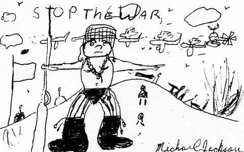 は、1971年、7年生のイヤー・ブックにマイケル13歳が描いたイラスト。STOP THE WAR!ベトナム戦争反対の絵です。しっかりサインもしてます。